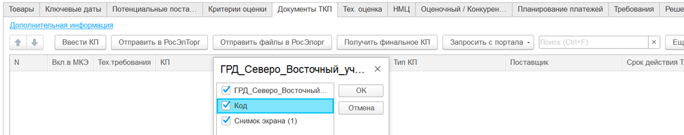 Из вкладки «Документы ТКП» пользователь выбирает нужные файлы и отправляет их на ЭТП.